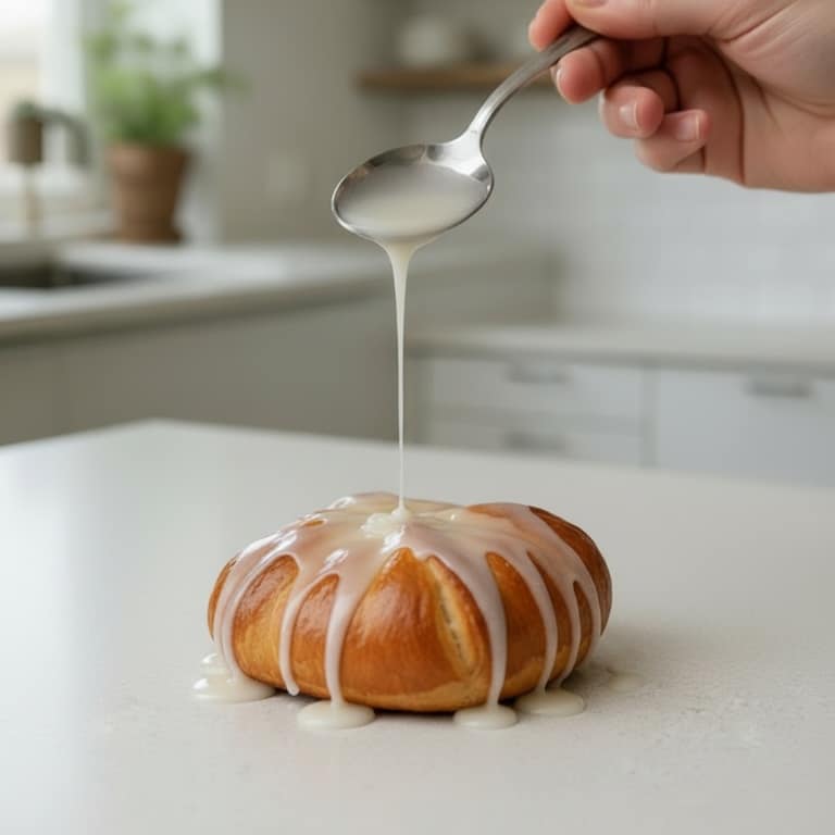 - Rør en glasur af 100 g flormelis og 2 spsk vand