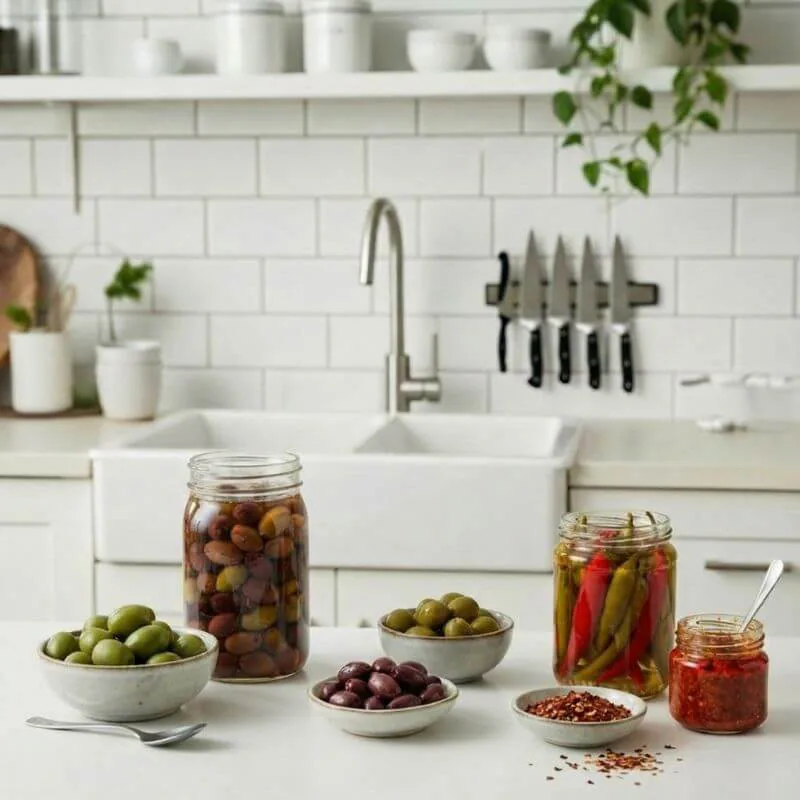 - Topping og fyld: grofthakkede oliven og mild chili på sprøde kartofler, grøntsagsfritter, fladbrød eller små tærter giver både salt, syre og varme.